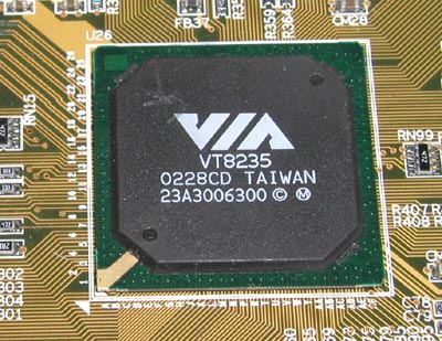 VT8235南桥则提供了完全的网络和连接能力,比如支持6 USB 2.0接口,可以提供比USB 1.1高出40倍的传输速度,支持ATA-133接口规范,完全支持目前最大容量的硬盘设备。另外,10/100Mbps Ethernet、6声道AC-97声卡和MC-97调制解调器也被整合在了这颗芯片中。