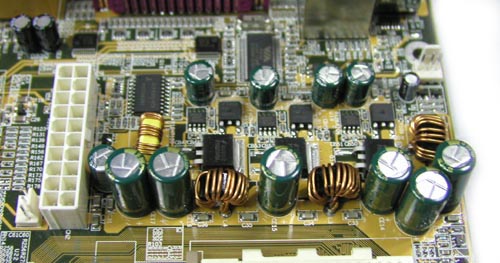 CPU供电电路采用了常用的三相回路供电,通过大容量电容和电感线圈进行滤波整流,来为处理器提供更理想波形的供电。