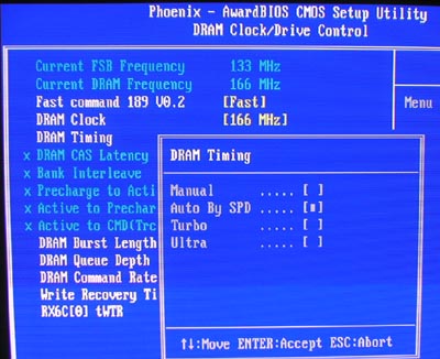 这里可以选择内存时钟频率,可以看到它支持DDR 400(200MHz),我们使用DDR 400系统也能比较稳定的运行。